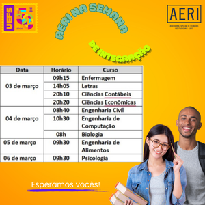 Vem conosco!!! Confira a programação e venha participar com a gente!!! Dioene Nascimento Coordenador de Mídias Digitais e Tradução Recomendado para você Eventos AERI NA SEMANA DE INTEGRAÇÃO DO CURSO DE ENFERMAGEM há 16 horas • 1 min de leitura Editais abertos EDITAL DE MOBILIDADE INTERNACIONAL 01/2026 há 14 dias • 1 min de leitura Editais abertos EDITAL DE MOBILIDADE ACADÊMICA 02/2025 - AERI UEFS RESULTADO FINAL (ERRATA) há 2 meses • 1 min de leitura